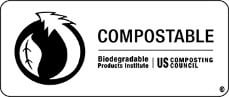 ![]() | The Compostable Logo (Biodegradable Products Institute Label – BPI) The Compostable Logo is issued by the Biodegradable Products Institute (BPI) and is a compostability seal which identifies a North American bioplastic product as compostable and The Compostable Logo signifies a product meets the ASTM 6400 / 6868 standards for compostability. |